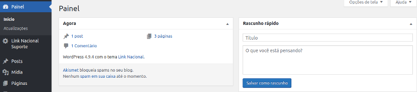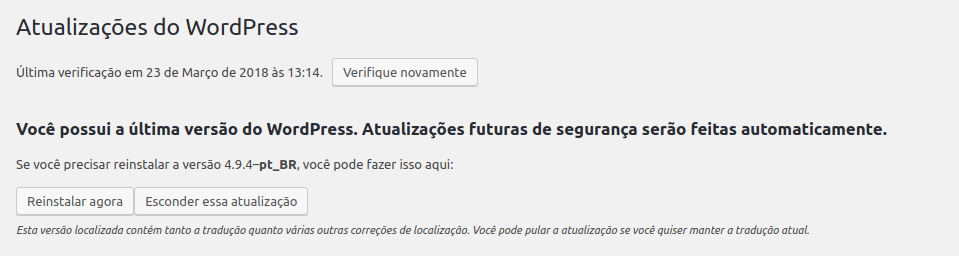 Nessa parte, é mostrada a versão atual do WordPress e se há uma nova atualização. De forma periódica, o WordPress faz uma verificação automática de novas atualizações.Em caso do WordPress estiver desatualizado, irá aparecer uma mensagem de notificação. No lugar do botão Reinstalar agora aparecerá a opção para realizar a atualização do WordPress.Nós criamos seu site