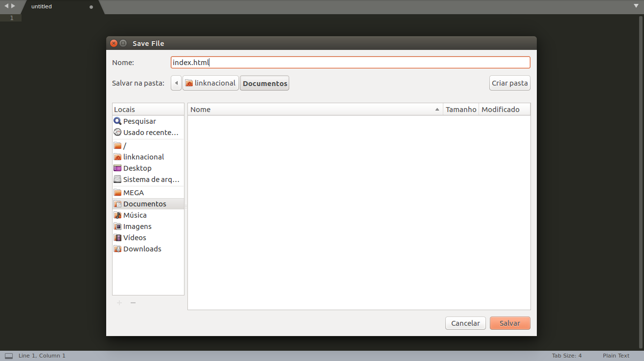 Com o editor aberto, aperte os botões Ctrl + S para salvar o arquivo. Esse passo é importante pois o editor possui comportamento diferentes de acordo com a linguagem utilizada.No campo Nome coloque index.html. É importante colocar a extensão .html quando for salvar, para o editor entender com qual linguagem irá trabalhar.Observação: O arquivo index é o primeiro arquivo que os navegadores buscam na hospedagem ao acessar o site.