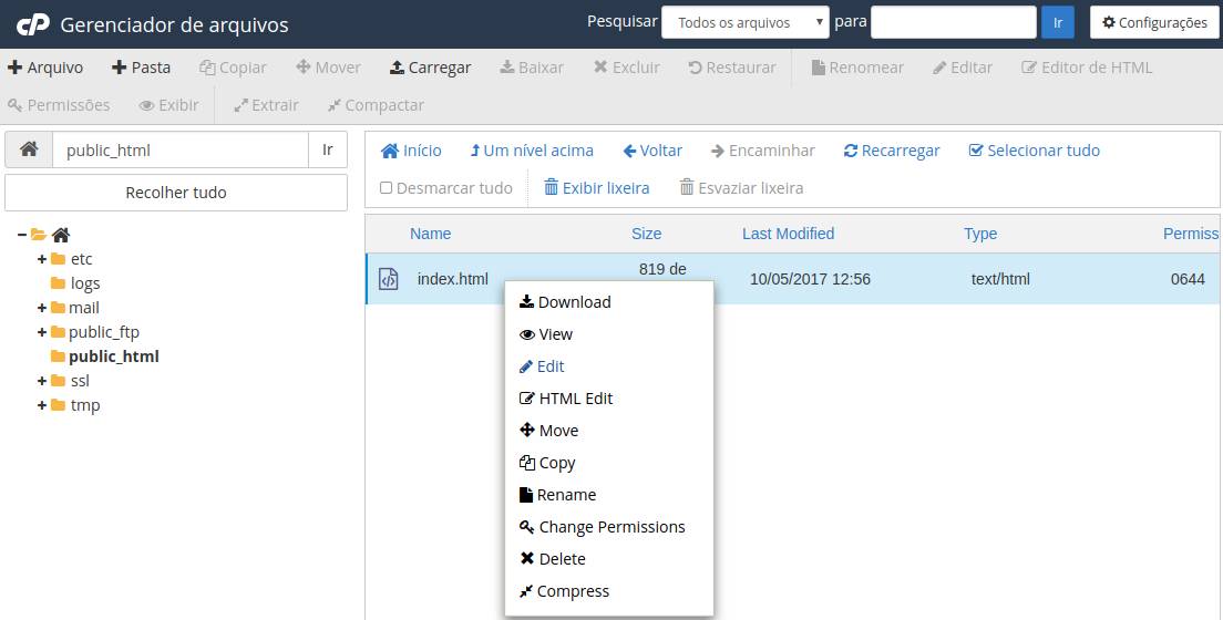 Dica: O Gerenciador de arquivos conta com uma ferramenta para editar os arquivos (HMTL, PHP e TXT) dentro da própria hospedagem. Clique com o botão direito do mouse no arquivo e clique na opção Edit.Se ainda estiver com dúvidas, deixe nos comentários abaixo que teremos o prazer de responder.
