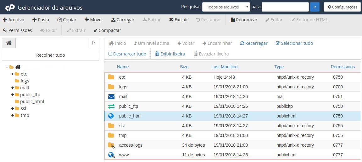 Dentro do Gerenciador de arquivos, cliquei duas vezes na pasta public_html. Nessa pasta fica todo o conteúdo do site.