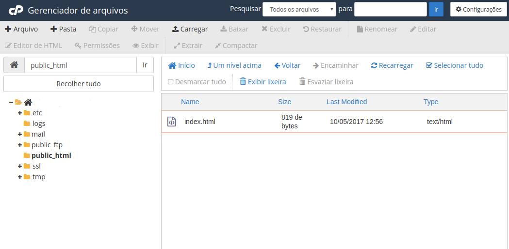 Após acessar a pasta public_html, clique na opção Carregar no topo da página e selecione o arquivo a partir do seu computador e aguarde o upload do arquivo.O arquivo foi adicionado com sucesso!