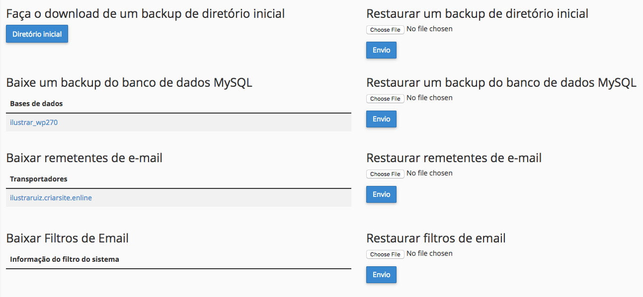 É possível fazer backups parciais da hospedagem no cPanel como: Arquivos da hospedagem, banco de dados, e-mails e filtro de e-mails. Para fazer a cópia de segurança, basta clicar no item desejado para iniciar o download.Também é possível restaurar uma cópia de segurança salva. Na coluna à direita (mostrado na imagem a abaixo), clique em Choose file para selecionar um arquivo a partir do seu computador e depois clique no botão para enviar.Nós temos a solução