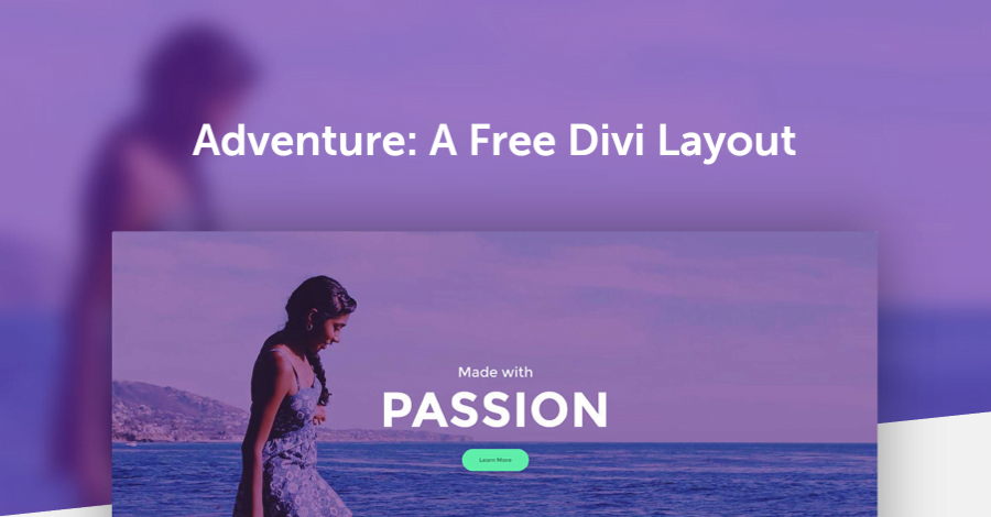 Aventura é um layout de uma página bonita com muitas seções grandes e originais. De acordo com seu desenvolvedor Maciej Ekstedt, a Adventure é mais adequada para agências de viagens, blogs pessoais / de viagens, portfólios, galerias de fotos e muito mais. Este layout fornece um excelente ponto de partida para o seu próximo projeto Divi. Tem um design lindo, então confira.