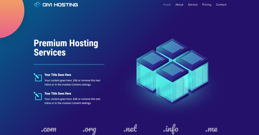A Divi Hosting foi projetada tendo em mente as empresas de hospedagem de domínio. Inclui cinco páginas: casa, sobre, serviço, preços e contato. O design usa muitos fundos gradientes azuis escuros e gradientes azuis e verdes para os gráficos. Os destaques estão em cores mais fortes e destacam-se bem. Os títulos amarelos parecem particularmente bons. Muitas das seções têm divisores extra-ondulados. Alguns têm gráficos que se sobrepõem a divisores. Eu gosto dos sinopses que são deslocados uns dos outros e mostram uma sombra de caixa 3D em negrito em foco.
