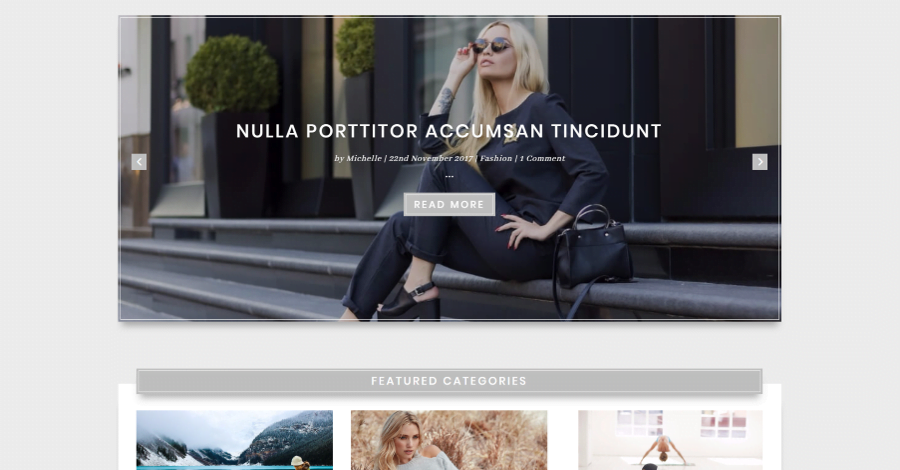 Elegant Blog Layout é um layout de uma página, sem largura total, projetado especificamente para blogs. As seções de conteúdo são rotuladas com títulos que se destacam. Cada um dos elementos de conteúdo usa efeitos de sombra. A barra lateral segue o mesmo estilo. Ele exibe as postagens mais recentes em um controle deslizante, seguidas por categorias em destaque em três colunas e as postagens mais recentes em um formato de coluna única e dupla. O layout faz jus ao seu nome elegante.