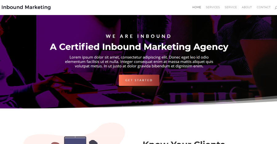 Inbound Marketing foi projetado com agências de marketing e desenvolvedores web em mente. Inclui cinco páginas personalizadas: pouso, sobre, serviços, serviço e contato. Imagens e gráficos gratuitos estão incluídos. Eu gosto do esquema de cores azul e laranja. Os recursos incluem divisores de seção angular, gradientes para planos de fundo e botões e muitos elementos sobrepostos. Se você está procurando um design limpo que se destaque, esta é uma ótima escolha.