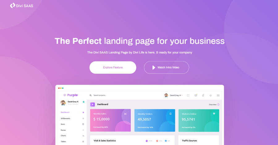 A Divi SAAS Landing Page é uma landing page multiuso projetada para empresas SAAS (software as a service) ou qualquer outro tipo de negócio. As seções estilizadas incluem: herói, serviços, visão geral, bate-papo ao vivo, depoimentos e boletins informativos do CTA. Ele tem tons exclusivos de roxo, azul e verde que são usados ​​em todo o layout em planos de fundo e gráficos. Eu gosto especialmente da seção de depoimentos que mostra imagens circuladas como bolhas ao redor do depoimento com uma imagem, texto e gráficos de citações no centro.