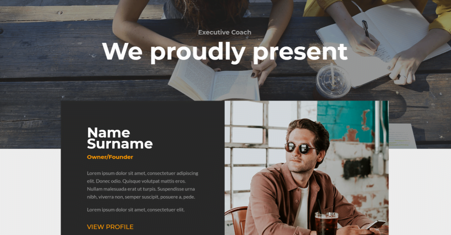 Coaching e Consultoria é um layout de uma página projetado para treinadores e consultores, mas pode ser usado para qualquer tipo de negócio. Uma imagem em tela cheia exibe um título, slogan e CTAs. Um vídeo incorporado com caixa de sombra é colocado ao lado de um CTA para descrever o negócio. Sinopse com estilo mostra o processo de trabalho. Uma seção de largura total inclui um controle deslizante de depoimento. As tabelas de preços estilizadas são colocadas sobre uma imagem de fundo. Os últimos posts do blog são denominados cartões slim. Ele também inclui um formulário de contato estilizado e uma seção estilizada para exibir os logotipos do cliente.