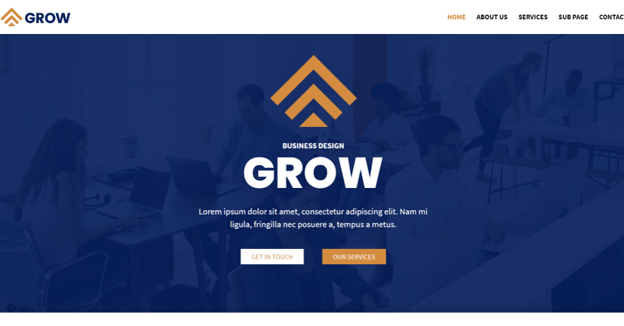 Grow foi projetado para qualquer tipo de site de negócios. Inclui cinco páginas: casa, sobre, serviços, serviços e contato. Ele usa muitas sobreposições em azul escuro e amarelo para criar CTAs que se destacam, dando ao design uma sensação profissional. Eu gosto especialmente da seção de serviços com blocos de imagens e sinopses que criam um design de mosaico e os blocos usados ​​para mostrar os serviços na página de serviços têm um design de cartão alto que quase se parece com posts de blog.