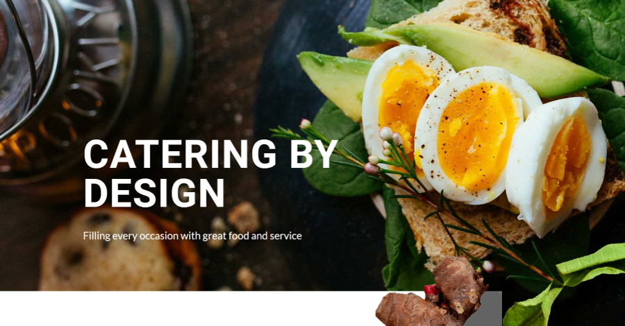Catering um layout de uma página para qualquer tipo de negócio de alimentos. Ele exibe um plano de fundo em tela cheia com título e slogan em uma sobreposição e imagens que se sobrepõem à próxima seção. Blocos sólidos de cor sobrepõem os fundos e incluem imagens que se sobrepõem a ambos. Os blocos incluem texto e ícones que correspondem ao gênero do negócio de catering. Linhas verticais conectam partes do layout juntas. Ele também inclui uma galeria de estilo, depoimento e formulário de contato.