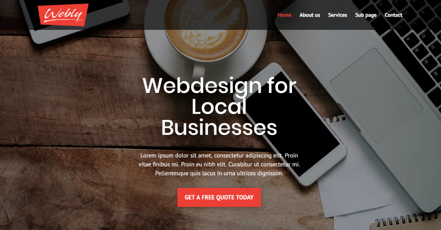 Webly é um layout de 5 páginas criado para empresas de web design. Inclui casa, sobre, serviços, subpágina e contato. A home page tem uma imagem em tela cheia com slogan, descrição e CTA. Rolagem revela sinopse com imagens, título, descrição e CTAs para os vários serviços. O layout também inclui contadores de números com estilo em uma sobreposição com CTA, referências como marcadores, um formulário de contato em uma sobreposição sobre uma imagem de plano de fundo, uma CTA com imagens sobrepostas e um formulário de contato sobre um plano de fundo branco.