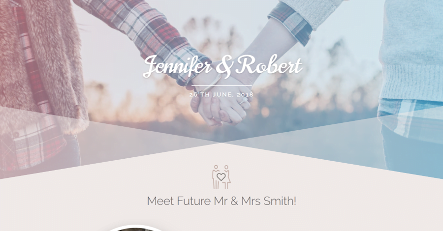 Happy é um layout de uma página para casamentos. Ele usa um design elegante para mostrar uma imagem de largura total com uma sobreposição que se mistura à próxima seção e exibe o título. Esse mesmo design é usado em todo o layout. A noiva e o noivo são exibidos com módulos personalizados. Uma cotação é colocada em uma sobreposição. Os anúncios mostram os vários eventos com locais e horários. Um formulário de contato é exibido sobre uma imagem de plano de fundo. Cores e fontes combinam com o tema do casamento.