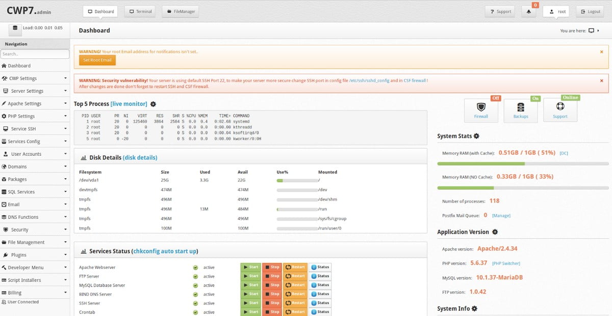 Se você estiver executando o CentOS no seu servidor virtual privado (VPS) e achar que o Webmin não é o mais indicado para você, o CentOS Web Panel é a solução ideal. Ele permite implantar e administrar servidores Web Apache, firewalls, bancos de dados MySQL, certificados SSL, um proxy reverso Nginx, email auto-hospedado e muito mais. Você também pode gerenciar usuários, implantar backups e acompanhar a integridade do sistema por meio do monitor de serviços.