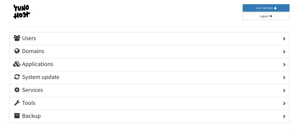Você pode administrar a VPS através da interface web YunoHost ou da linha de comando. O YunoHost suporta oficialmente o Debian 8 e é codificado principalmente em Python sob uma licença GPL de código aberto.