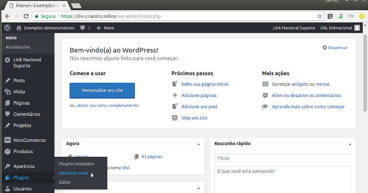 Com o cursor do mouse, vá no menu a esquerda, na aba Plugins e clique na opção Adicionar novo.