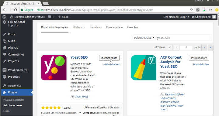 No campo de busca digite Yoast SEO, instale e ative o plugin indicado na imagem. Uma dica, é sempre verificar o nome do desenvolvedor antes de instalar qualquer plugin. No caso do Yoast SEO, o desenvolvedor é Team Yoast.