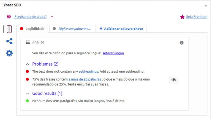 O Yoast SEO analisa o conteúdo redigido em tempo real