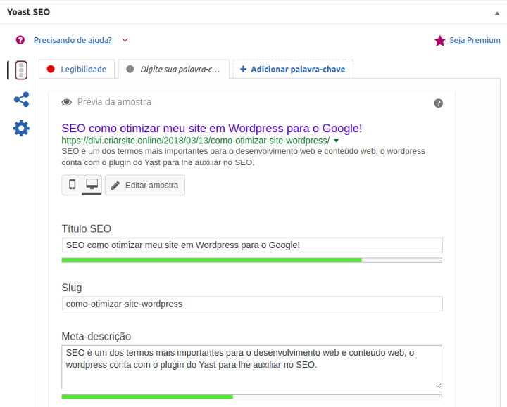 Ao clicar em Editar amostra, é possível definir o Título, Slug (url da página), e Meta-descrição. Um detalhe importante é a barra abaixo do Título e Meta-descrição, elas são uma forma de avaliar cada item (ele varia entre a cor laranja e verde).