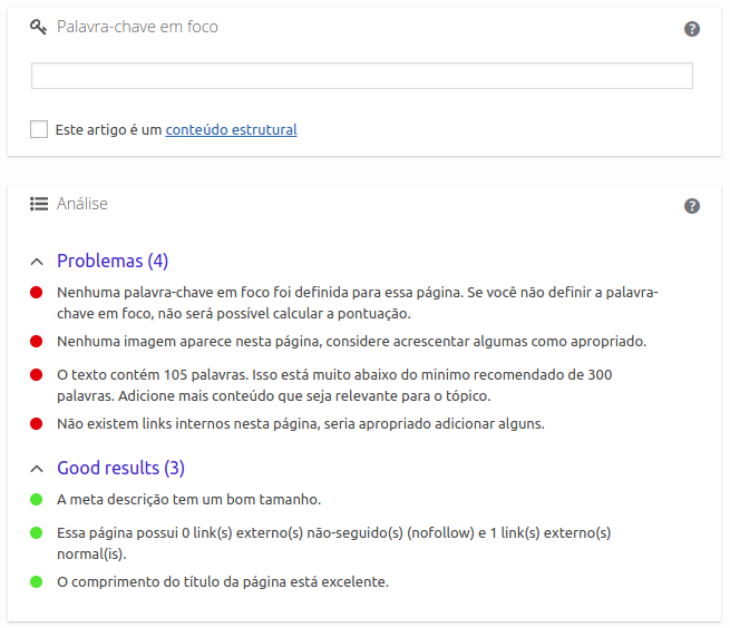 Abaixo da amostra é necessário definir a palavra-chave, a partir desta palavra o Yoast SEO irá mostrar dicas para otimizar o conteúdo da página, para os sites de buscas. Essas melhorias são indicadas pelos círculos laranja e vermelho, os itens marcados pelo círculo verde são itens com boa avaliação.