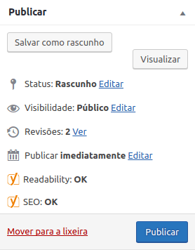 Do lado direito da página, acima do botão Publicar, é apresentado a avaliação geral da página (Legibilidade e SEO). Da mesma forma que os itens de melhorias são apresentados, a avaliação geral também possui 3 pontuações: Vermelho (Precisa de melhorias), Laranja (OK), Verde (Bom).