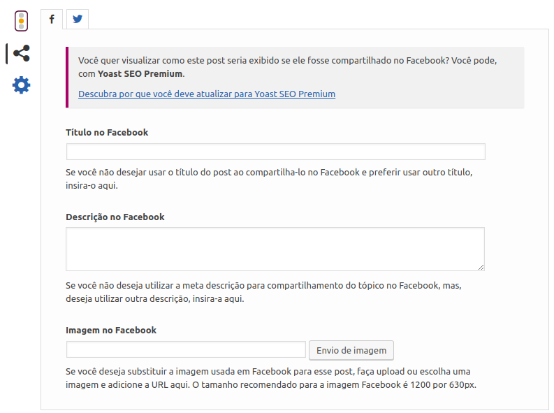 Navegando entre os ícones do lado esquerdo, no ícone de compartilhamento (segundo ícone) é possível configurar a visualização do post quando for compartilhado no Facebook e Twitter. É possível definir Título da publicação, descrição e foto de capa. Pode ser definido informações diferentes para cada um, ou mater todos iguais.