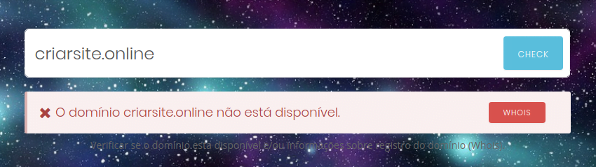 O status de um domínio pode ser visualizado na informação de WHOIS ao pesquisar um domínio. Para pesquisar um domínio acessa a área de domínios da Link Nacional, digite o nome do domínio e clique no botão, se o domínio estiver registrado abaixo do campo de pesquisa irá aparecer um botão WHOIS. Veja imagem abaixo: