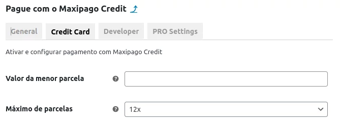 Ao habilitar o método de pagamento por Cartão de Débito ou Crédito via MaxiPago, a versão gratuita oferece configurações básicas, como mostrado na imagem ao lado. É importante notar que as imagens são ilustrativas e podem não refletir as atualizações mais recentes do plugin.