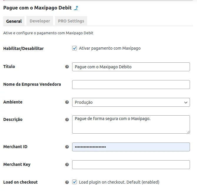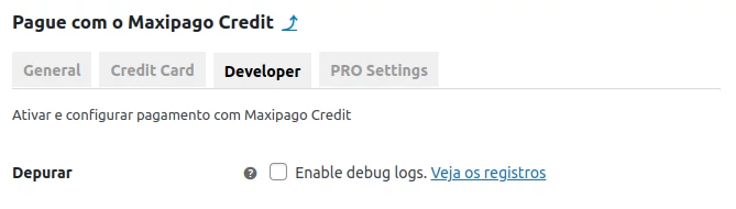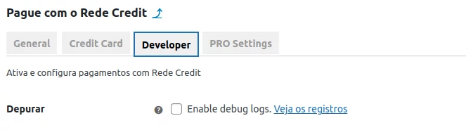 Para identificar erros, recomenda-se habilitar a verificação dos logs de erro. No entanto, utilize essa configuração apenas para esse fim, mantendo-a sempre desabilitada para garantir a privacidade dos dados. Para habilitar os logs de depuração, acesse as configurações do plugin, aba Desenvolvedor e ative a opção Ativar registro de depuração. Com o recurso ativado as transações serão armazenadas em um log.