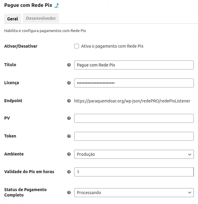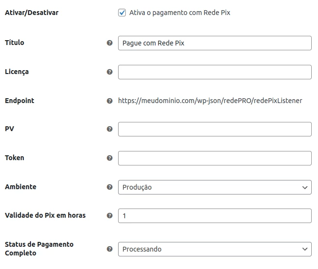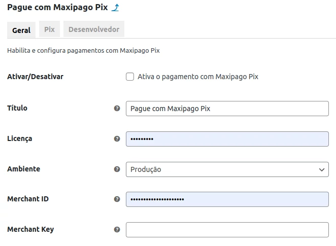 As configurações do PIX são intuitivas e contam com ícones de ajuda (?), que fornecem descrições detalhadas sobre cada campo, facilitando o entendimento e a configuração. Vale destacar que alguns itens podem aparecer em inglês devido ao processo de aprovação de traduções pelo WordPress. Isso não interfere no funcionamento do recurso.