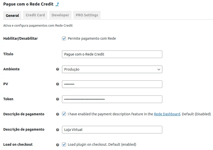 Ao habilitar o método de pagamento Cartão de Crédito Rede, a versão gratuita oferece configurações básicas, como mostrado na imagem abaixo. Observe que as imagens são ilustrativas e podem não refletir as atualizações mais recentes do plugin.