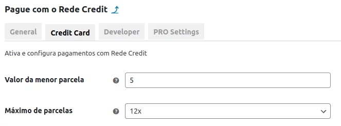 O Plugin Rede Gratuito permite configurar o parcelamento, oferecendo a opção de definir o número mínimo e máximo de parcelas disponíveis para os pagamentos no cartão de crédito. No entanto, na versão gratuita, não é possível definir os juros para cada parcela, sendo essa funcionalidade exclusiva da versão PRO.