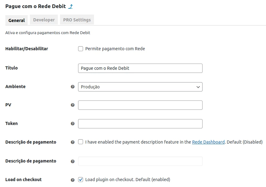 Ao habilitar o método de pagamento Cartão de Débito Rede, a versão gratuita disponibiliza configurações básicas, como ilustrado na imagem abaixo. Vale lembrar que as imagens são apenas ilustrativas e podem não refletir as atualizações mais recentes do plugin.