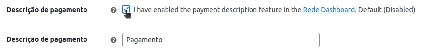 Após realizar essa configuração no portal da Rede, habilite a opção de descrição de pagamento no plugin. Caso esse passo não seja concluído corretamente no portal da Rede, sua transação poderá resultar em erro.