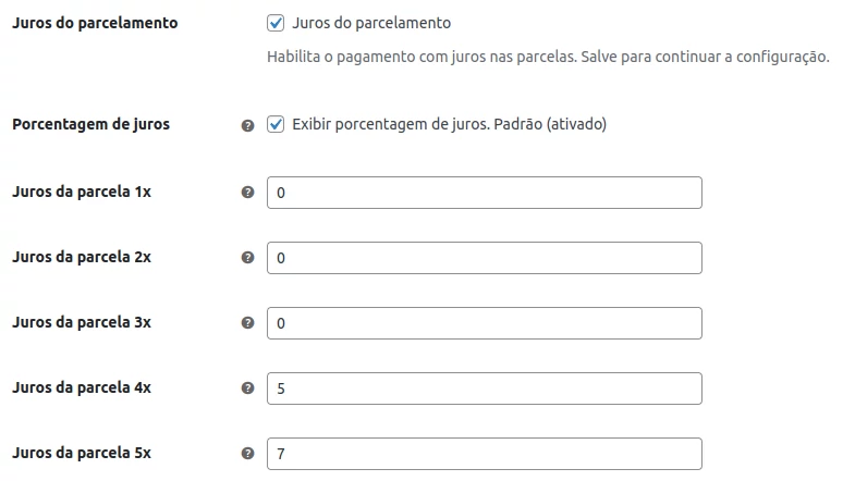 - Juros do parcelamento: Ao habilitar esse recurso, será possível configurar os juros para cada parcela.