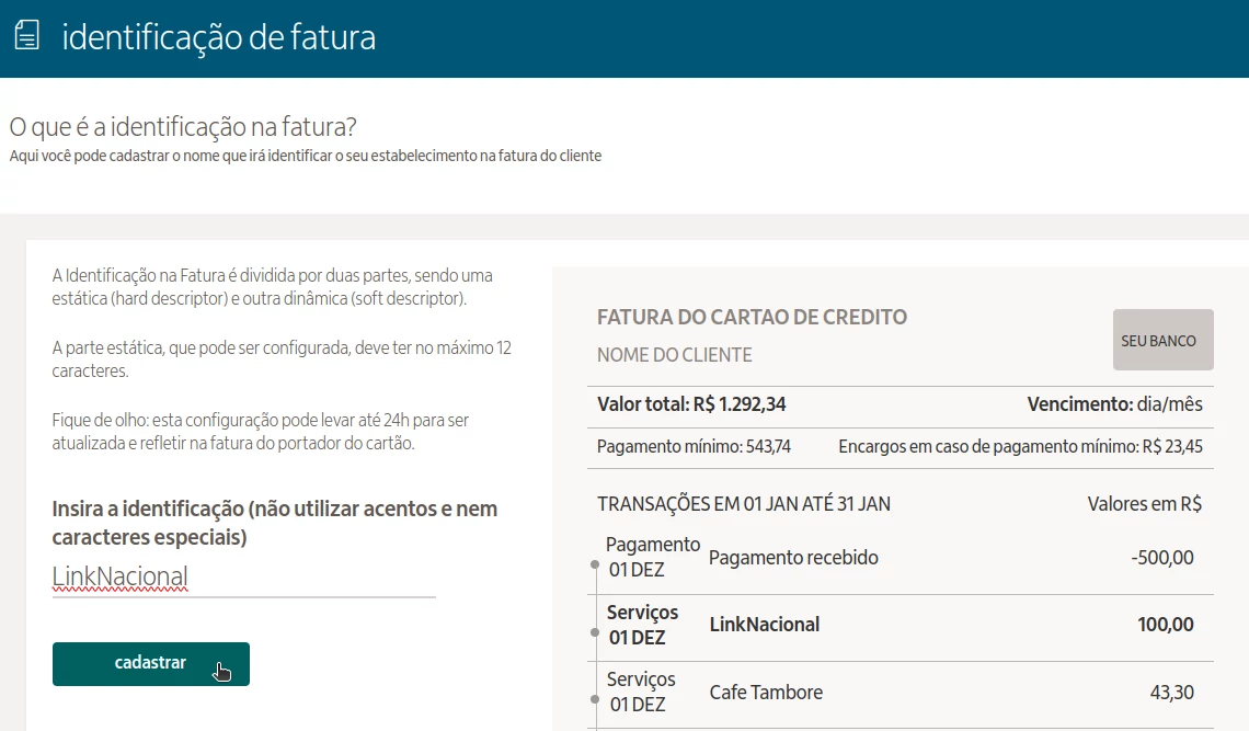 A configuração de descrição de pagamento é útil para que o comprador consiga identificar facilmente o seu estabelecimento, facilitando o reconhecimento da compra no extrato do cartão. No entanto, para utilizar esse recurso, ele precisa estar configurado dentro do portal da Rede.